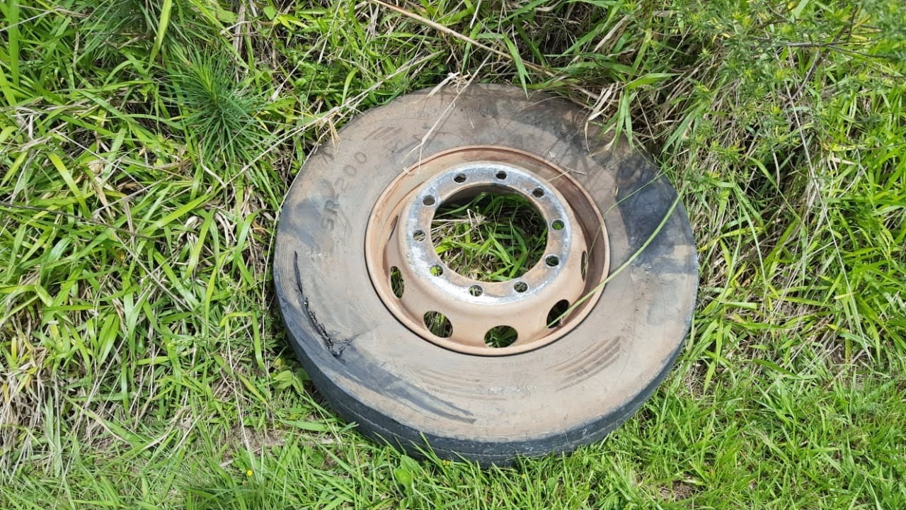 | Pneu com aro se desprendeu de carreta na PR-151, em Carambeí. Foto: PRE/Divulgação |