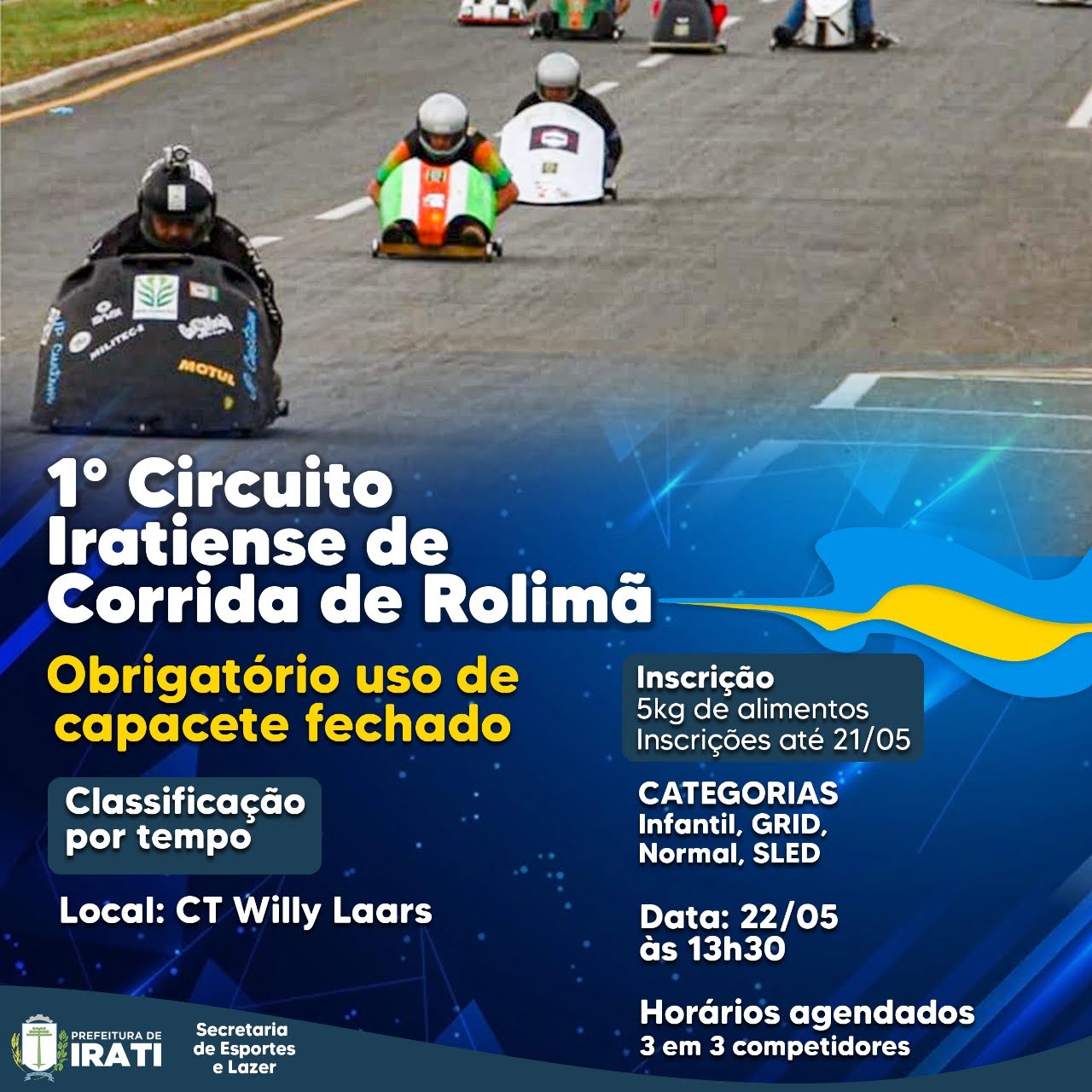 Já a disputa do rolimã do Circuito de Habilidades está com inscrições abertas até o dia 21 de maio. Para participar também é necessário destinar cinco quilos de alimentos. As categorias em disputa são infantil, grid, normal e sled. A participação será no sábado, dia 22 de maio, a partir das 13h30, no CT Willy Laars. A classificação será definida por tempo. Será obrigatório uso de capacete fechado. Em virtude da pandemia de coronavírus, o horário de participação será agendado de três em três competidores.