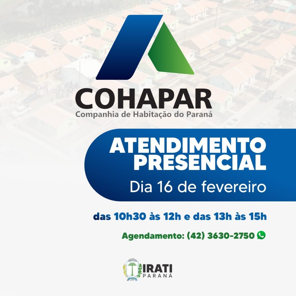 A Companhia de Habitação do Paraná (Cohapar) atenderá presencialmente em Irati no dia 16 de fevereiro. Os atendimentos serão feitos na Secretaria Municipal de Habitação, na Rua Doutor Correia, 242, no horário das 10h30min às 12 horas e das 13h às 15 horas.