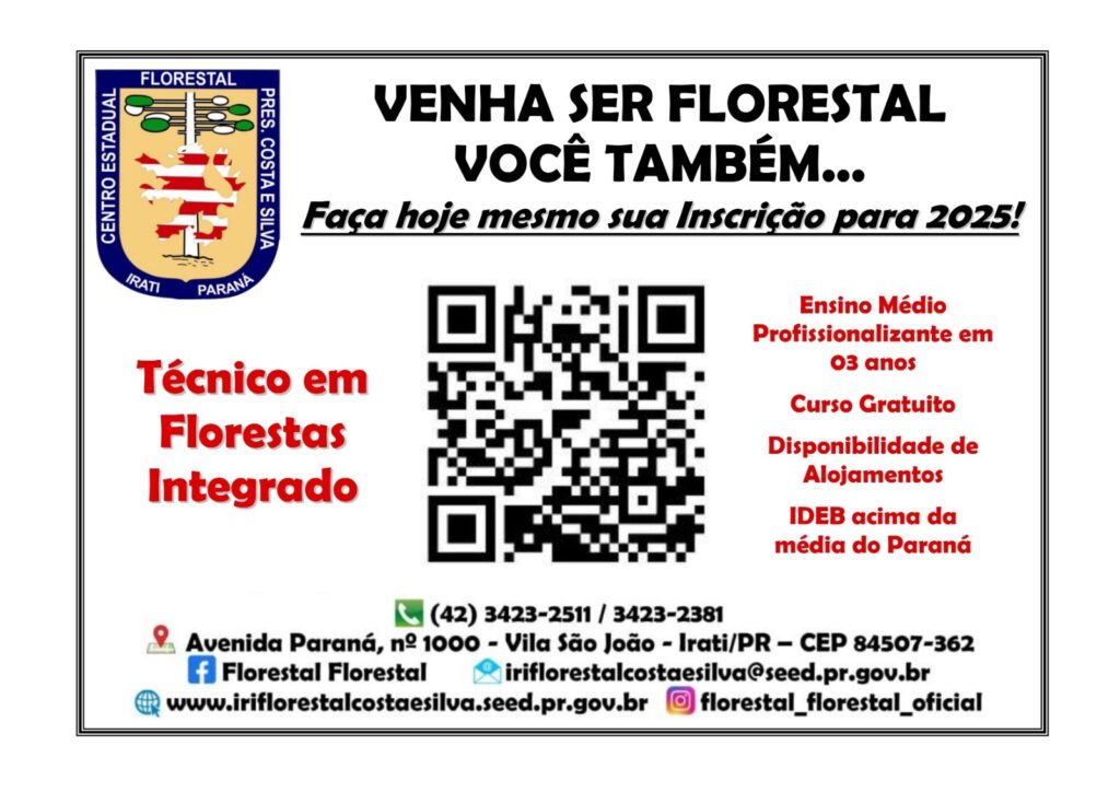 Mais informações podem ser obtidas pelos telefones (42) 3423-2511, 3423-2381 ou nas redes sociais do Colégio Florestal.