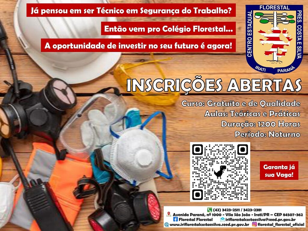 O Centro Florestal de Educação Profissional Presidente Costa e Silva, o Colégio Florestal de Irati, está com inscrições abertas para o curso Técnico em Segurança do Trabalho.