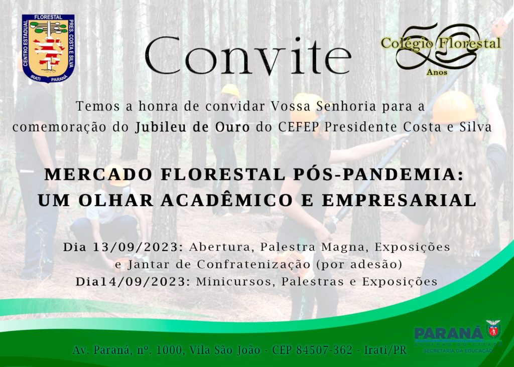 Em contato com a nossa reportagem, o professor Elisson Girardi convidou a comunidade para participar das atividades. “Entramos na semana de comemoração dos 50 anos do Colégio Florestal de Irati e temos a grata satisfação em convidar toda a comunidade escolar, toda população de Irati e região para participar conosco dessas comemorações. Então, quarta-feira, dia 13, vamos fazer a abertura do evento no colégio. À noite acontecerá um jantar no Espaço Santo Fole. Na quinta-feira, dia 14, serão realizadas várias palestras no colégio. Lembrando que as palestras, os minicursos são gratuitos, ou seja, sem custo”, ressalta o professor.