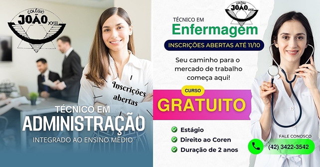 O Colégio Estadual João XXIII está com inscrições abertas até o próximo dia 11 para os cursos técnicos gratuitos em Enfermagem e em Administração integrado ao Ensino Médio. Os interessados podem procurar a secretaria do colégio, na Rua Santa Catarina, 260, na Vila São João, ou solicitar informações pelas redes sociais, pelo telefone do colégio, (42) 3422-3542 ou pelo e-mail irijoao@seed.pr.gov.br