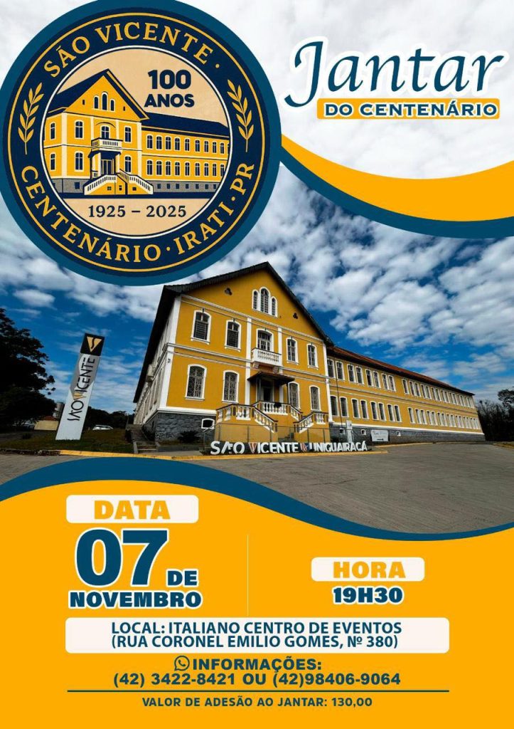 O jantar de comemoração aos 100 anos do Colégio São Vicente de Irati ocorrerá no dia 7 de novembro, sexta-feira, às 19h30, no Centro de Eventos Italiano. Os ingressos custam 130 reais e podem ser adquiridos por WhatsApp ou telefone no (42) 3422-8421, ou pessoalmente na instituição.