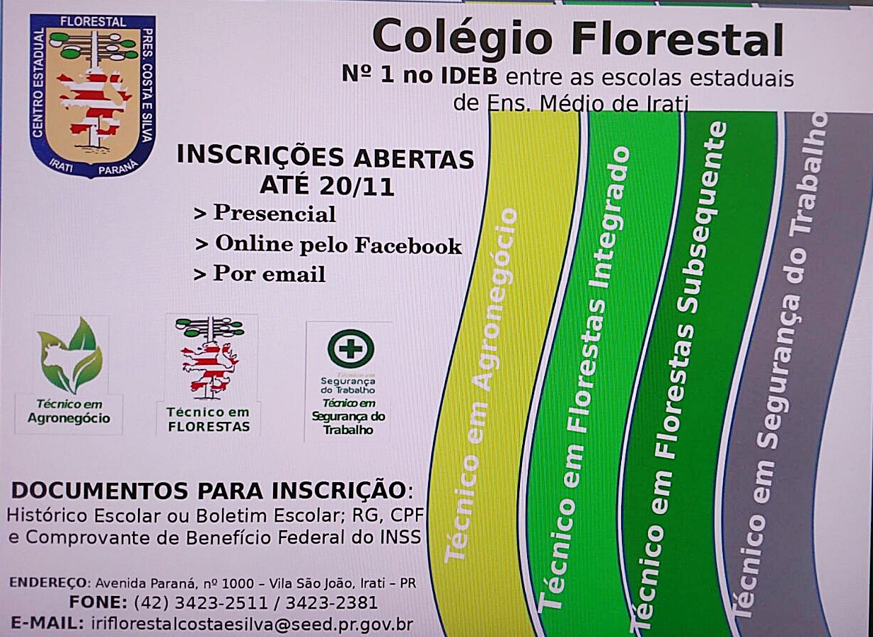 O Centro Florestal de Educação Profissional Presidente Costa e Silva está com inscrições abertas para os cursos Técnico em Agronegócio (noturno), Técnico em Florestas Integrado (para alunos que estão concluindo o 9º ano do Ensino Fundamental em 2020 ou concluíram em anos anteriores) e subsequente (para estudantes que estão concluindo o 3º ano do Ensino Médio em 2020 ou concluíram em anos anteriores), ambos diurnos, e Técnico em Segurança do Trabalho (noturno). Para os estudantes do curso Técnico em Florestas de outros municípios ou das comunidades do interior de Irati, o colégio disponibiliza alojamentos masculino e feminino.