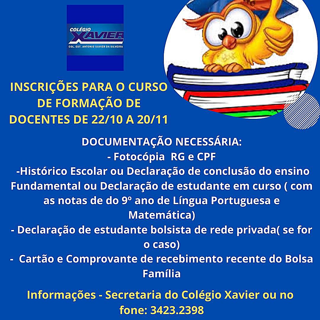O Colégio Estadual Antônio Xavier da Silveira está com inscrições abertas para o curso de Formação de Docentes integrado ao Ensino Médio. Os interessados devem encaminhar fotocópia do RG ou CPF, Histórico Escolar ou declaração de conclusão do Ensino Fundamental ou de estudante em curso (com as notas do 9º ano de Língua Portuguesa e Matemática), declaração de estudante bolsista de rede privada (se for o caso), cartão e comprovante recente do recebimento do Bolsa Família. Mais informações na secretaria do colégio, na Rua Nossa Senhora de Fátima, 815, ou pelo telefone (42) 3423-2398.