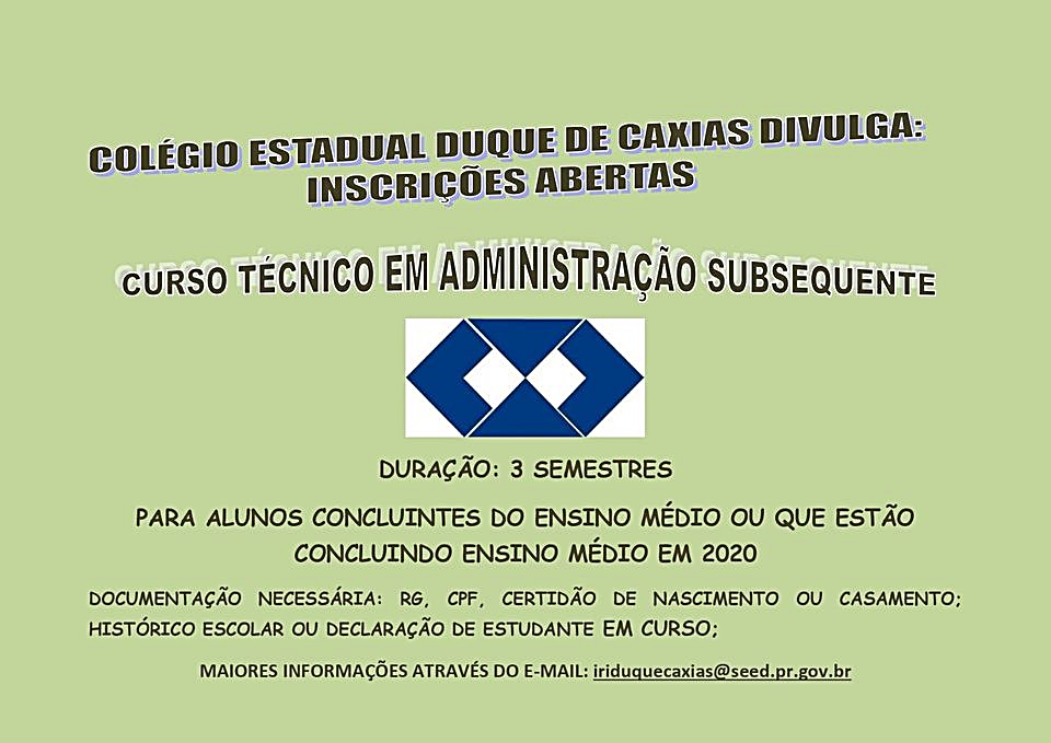 Já o Colégio Estadual Duque de Caxias abriu vagas para mais uma turma do curso Técnico em Administração Subsequente, para quem já terminou o Ensino Médio ou o concluirá ainda em 2020. Os interessados devem encaminhar RG, CPF, Certidão de Nascimento ou Casamento, Histórico Escolar ou Declaração de Estudante em Curso. Mais informações pelo e-mail iriduquecaxias@seed.pr.gov.br.