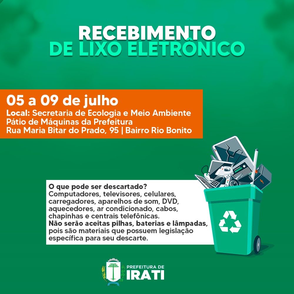 A Secretaria de Ecologia e Meio Ambiente de Irati realizará uma campanha de recolhimento de lixo eletrônico entre os dias 5 e 9 de julho.
