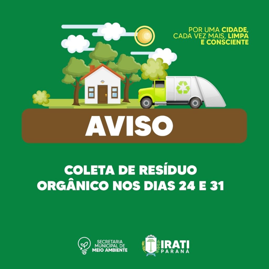 A Secretaria de Meio Ambiente de Irati comunica que a empresa Ecovale, responsável pela coleta do lixo orgânico no município, vai alterar o horário de recolhimento nos dias 24 e 31 de dezembro (dois próximos sábados).