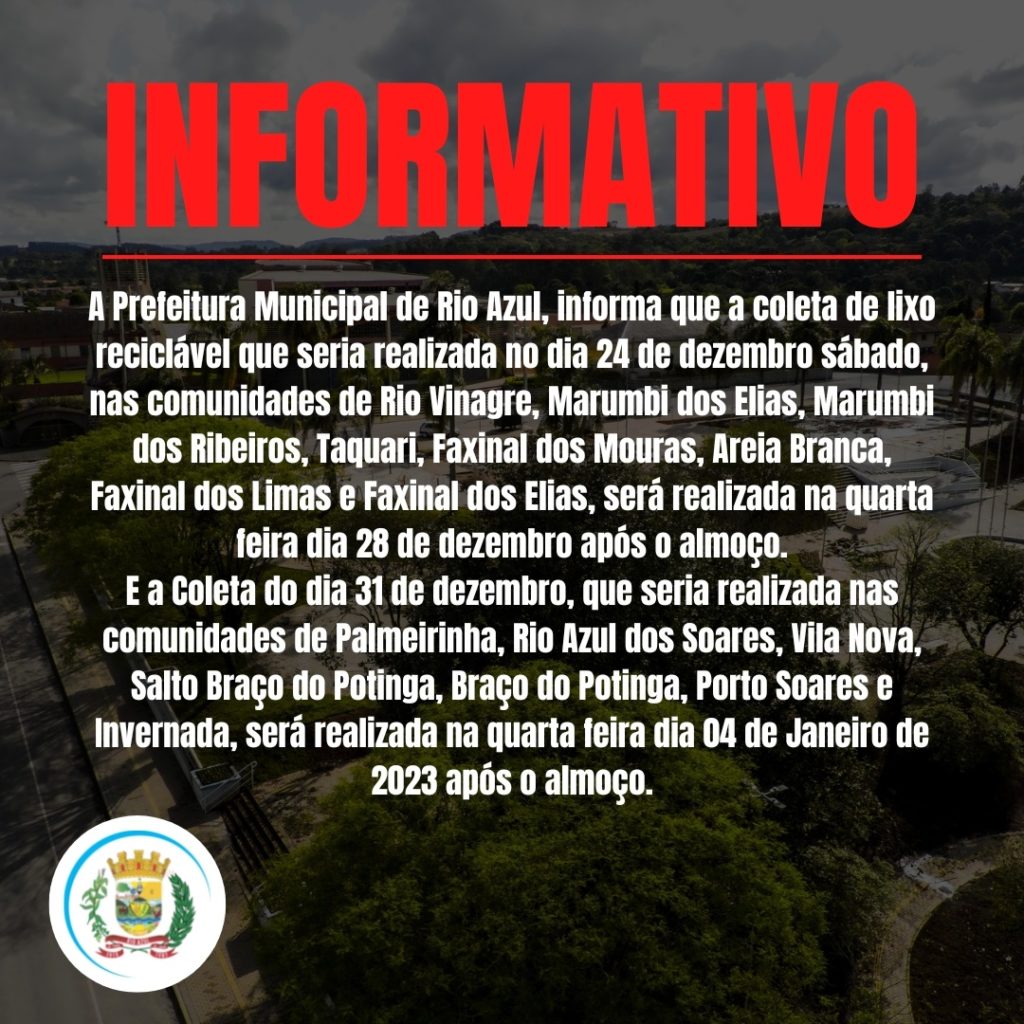 Alteração de datas de recolhimento do lixo reciclável em Rio Azul: Já em Rio Azul, a coleta de lixo reciclável que seria realizada no sábado, 24, nas localidades de Rio Vinagre, Marumbi dos Elias, Marumbi dos Ribeiros, Taquari, Faxinal dos Mouras, Areia Branca, Faxinal dos Elias e Faxinal dos Limas, foi transferida para o dia 28 de dezembro (quarta-feira), após o almoço.