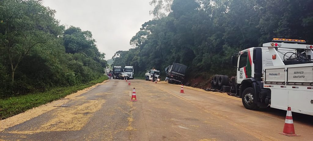 Uma colisão lateral entre dois caminhões bitrem causou o tombamento de um semirreboque de um dos veículos na madrugada desta sexta-feira, 12, na altura do km 316 da BR 277, em Guarapuava. Ninguém ficou ferido neste acidente.