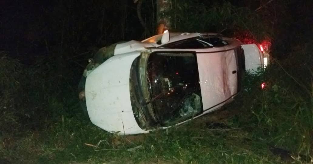 | Ford Fiesta capotou na PR-160, em Telêmaco Borba. Foto: PRE/Divulgação |