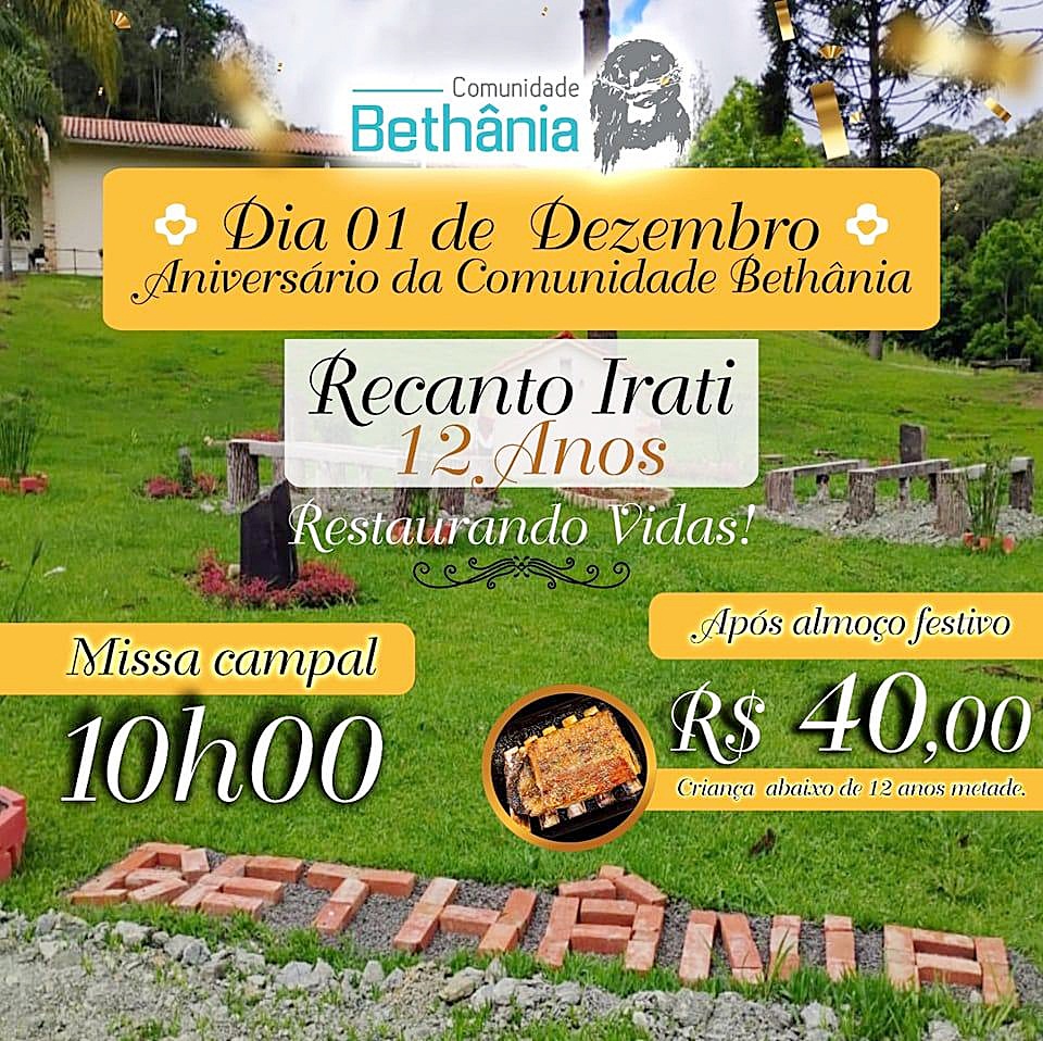 A Comunidade Bethânia de Irati irá comemorar 12 anos de existência nesta segunda-feira, 25 de novembro. Para marcar a data, será realizado um almoço comemorativo no dia 1º de dezembro (domingo).
