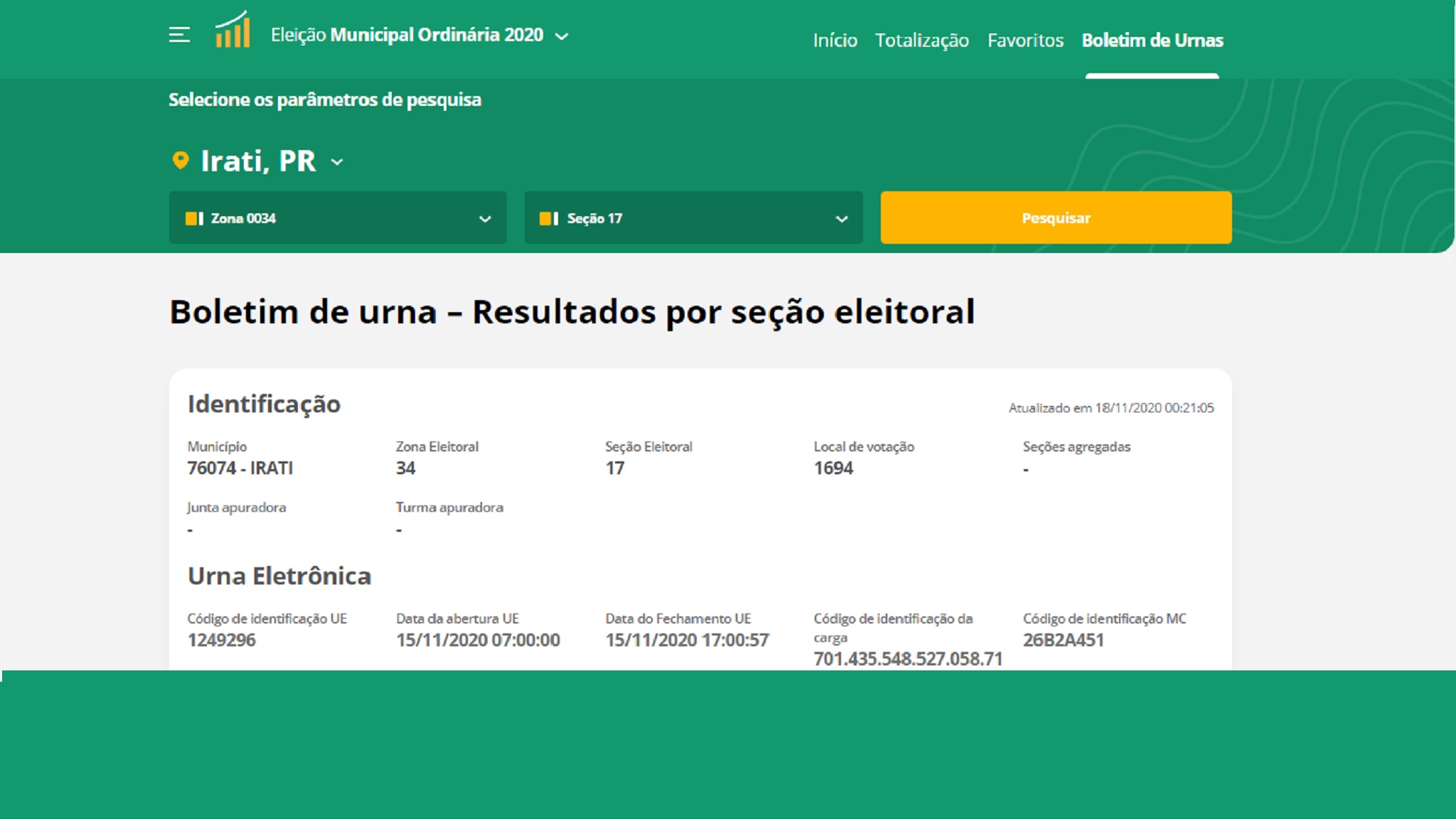Qual foi a votação que cada candidato teve na sua seção? Quer saber? Veja aqui como foi a votação em cada seção de Irati. Assista o vídeo com a explicação de como se procura, em seguida, clique neste link que vai direto para a área específica onde você vai selecionar a seção, no site do TSE. Começa por vereadores (aparece só os que tiveram votos), separados por partidos e no final tem a votação dos candidatos a prefeito. Para saber o nome da seção que o número corresponde, procure na lista abaixo.