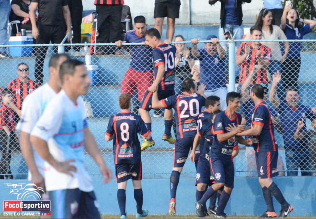 Imagem da final da Copa Folha de Irati de 2023. Jogadores do Passatempo comemorando um dos gols na partida contra o Pena Sports/Wisa Informática. Foto: Osmair Turko/Foco Esportivo