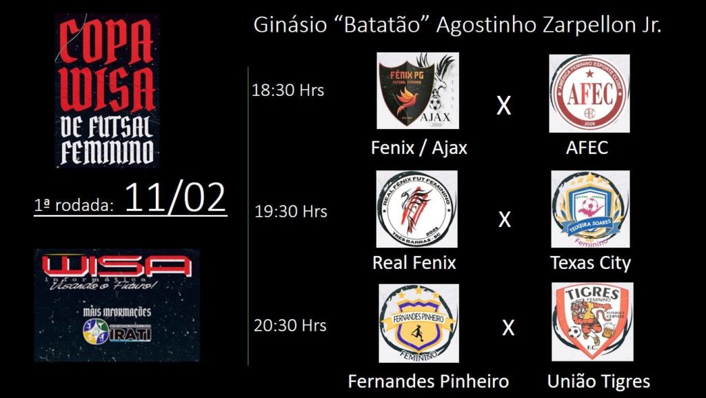 A Copa Wisa de Futsal Feminino começa neste sábado com três jogos no ginásio Agostinho Zarpellon Junior (Batatão), em Irati. Fênix/Ajax e América Feminino (AFEC) jogam às 18h30. Real Fênix e Texas City se enfrentam às 19h30. Já a equipe de Fernandes Pinheiro joga contra o Tigres às 20h30.