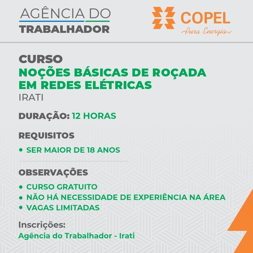 A Companhia Paranaense de Energia (Copel) realizará um curso gratuito de roçada em redes elétricas em Irati, a partir desta terça-feira, às 13h. A idade mínima para participar é de 18 anos. O curso presencial terá duração de 12 horas divididas em dois dias.