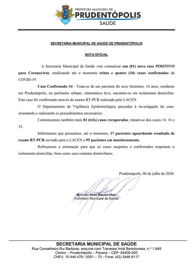 A 34ª paciente é uma adolescente, de 16 anos, que reside na área urbana. Ela teve sintomas leves e está em isolamento domiciliar. Esse caso foi confirmado através de exame RT-PCR realizado pelo Laboratório Central do Estado do Paraná (Lacen/PR).