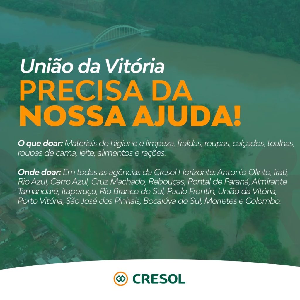 A Cresol Horizonte está promovendo uma campanha de arrecadação de donativos, que serão doados para famílias afetadas pela enchente dos últimos dias em União da Vitória.