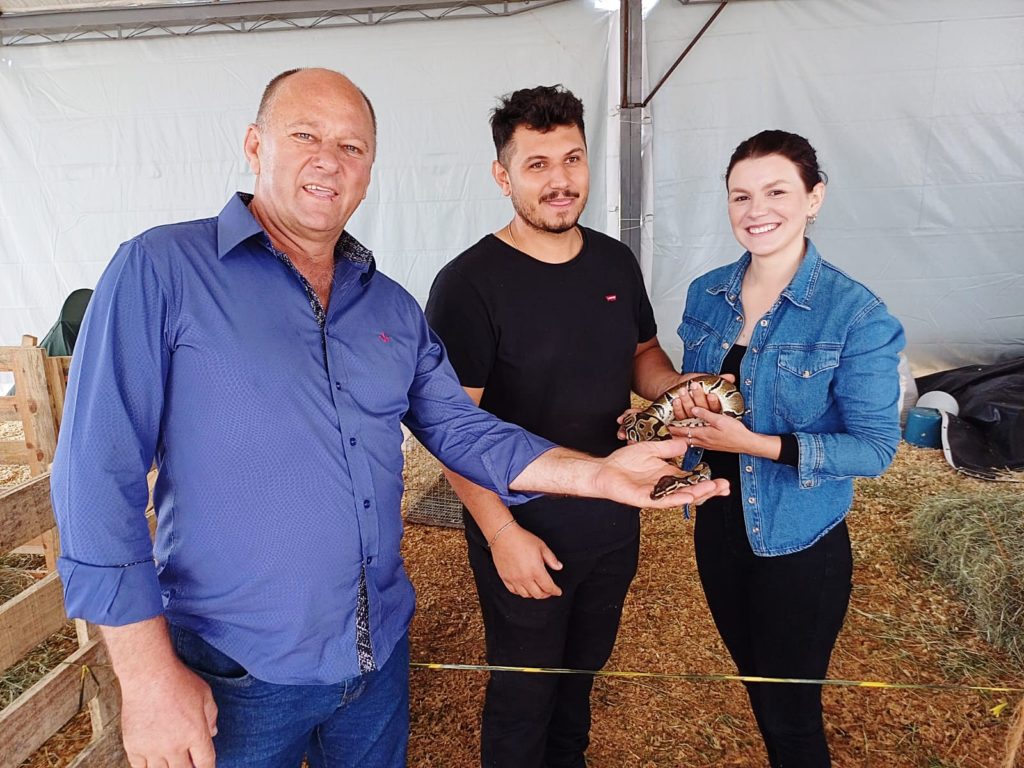 Na foto, o secretário de Agropecuária, Abastecimento e Segurança Alimentar, Raimundo Gnatkowski (Mundio) e o criador César Ribeiro com uma cobra da espécie Piton, sem veneno. Foto: Paulo Sava