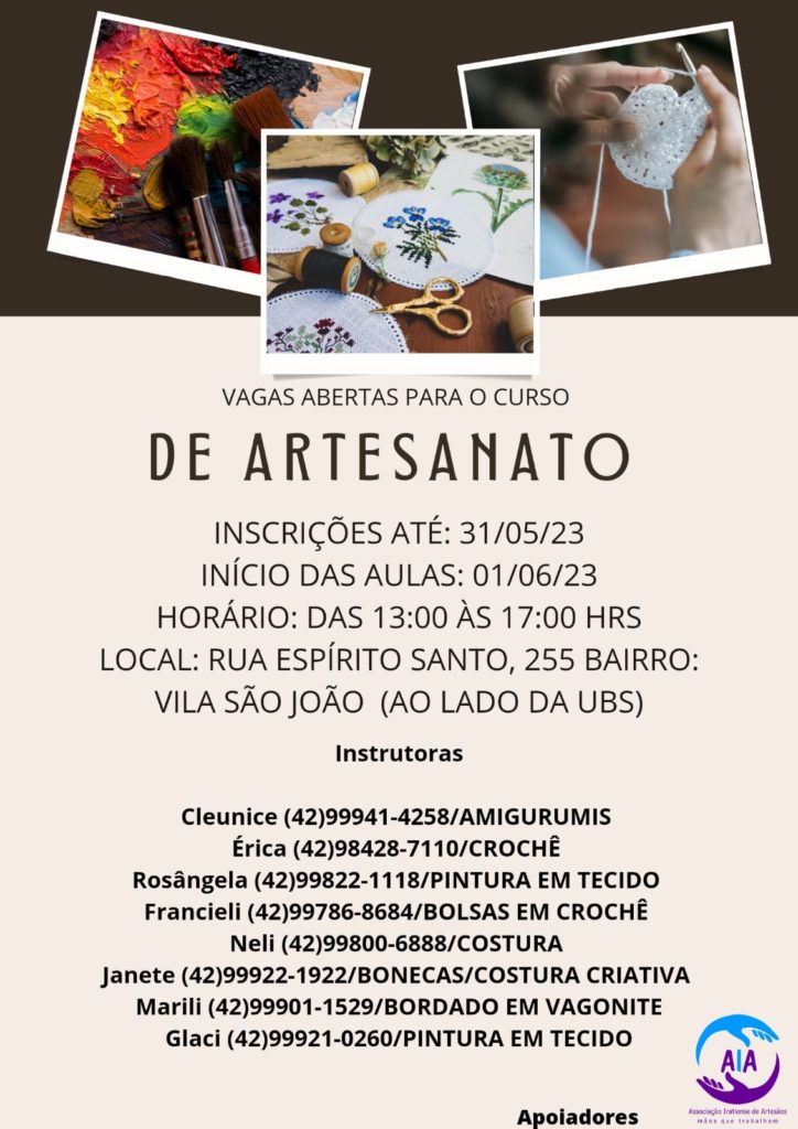 A Associação Iratiense de Artesãos realizará cursos de artesanato na Vila São João, em Irati. As aulas iniciam no dia 1º de junho (próxima quinta-feira). As inscrições podem ser feitas até o dia 31 de maio (quarta-feira).