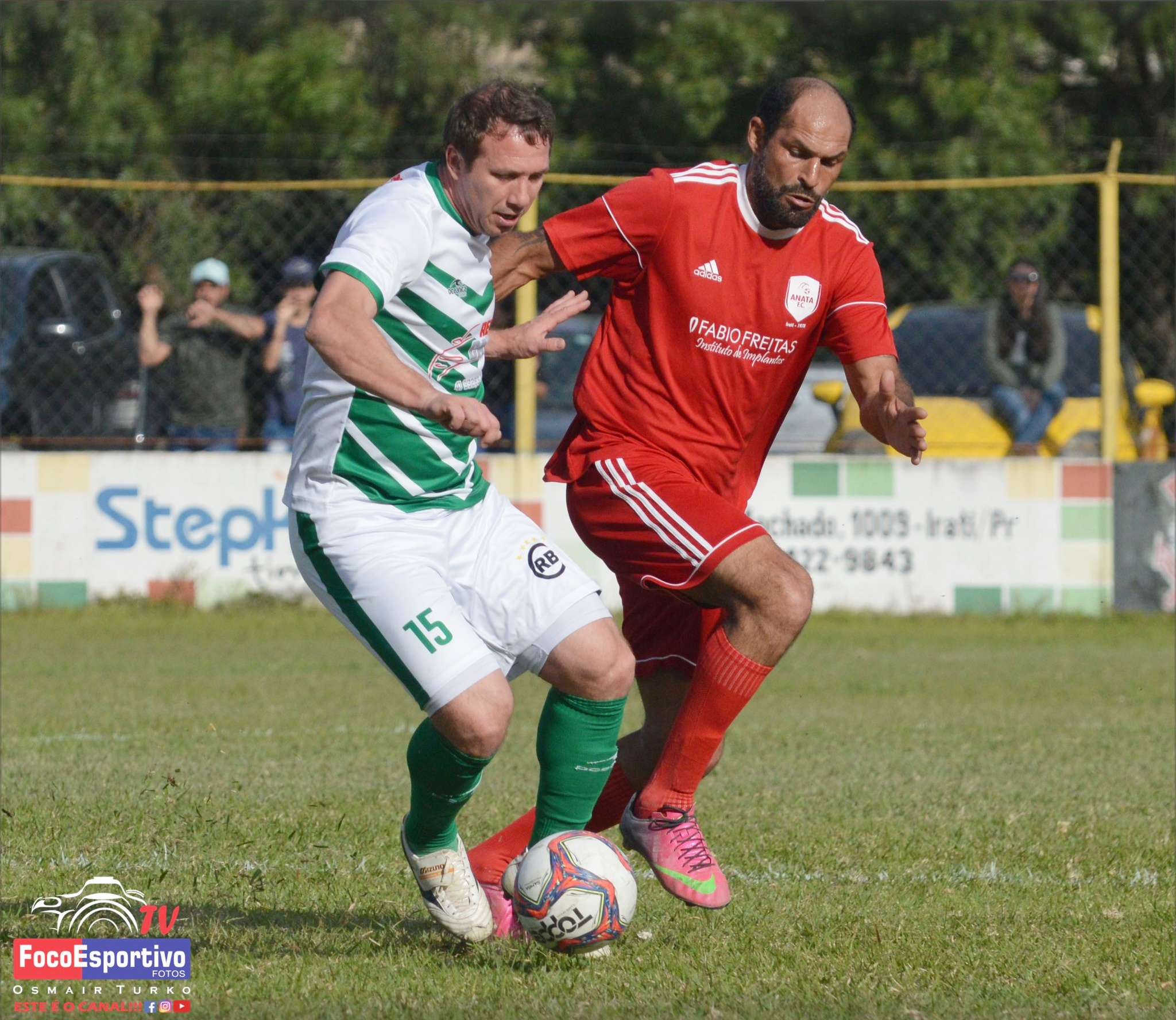 | Luis Augusto do CRB e Black do Anata em disputa da bola no primeiro jogo da final do Campeonato Veteranos de Irati. Foto: Osmair Turko/Foco Esportivo |