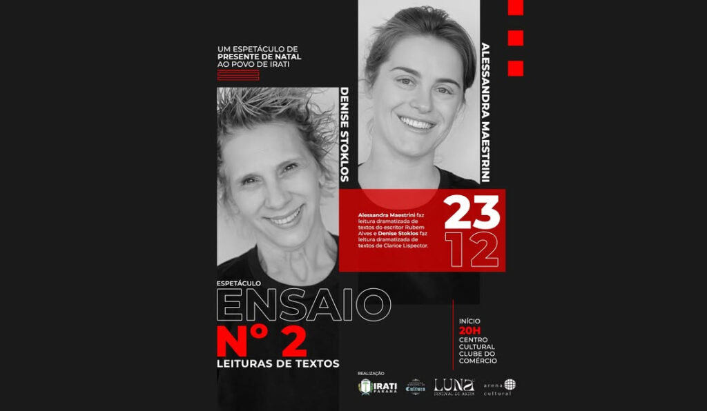 Irati receberá um presente natalino único neste ano: o espetáculo “Ensaio Nº 2 – Leituras de Textos”, com a presença ilustre de Denise Stoklos, um dos maiores nomes do teatro brasileiro, e da renomada atriz Alessandra Maestrini, conhecida por sua versatilidade e talento nos palcos e na televisão, tendo como um dos destaques de sua carreira a personagem “Bozena”, da série televisiva “Toma Lá, Dá Cá”. A apresentação será no dia 23 de dezembro, às 20h, no Centro Cultural Clube do Comércio.