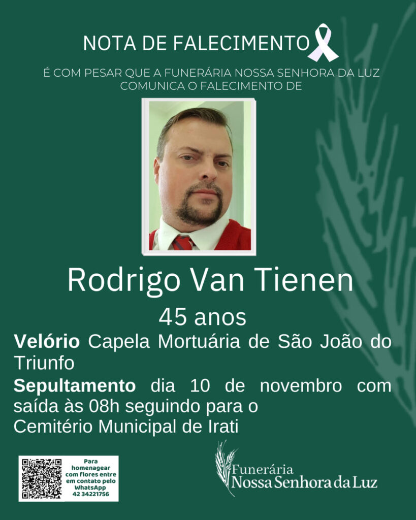 O dentista era natural de Irati e atualmente morava em São João do Triunfo. O corpo dele será velado na Capela Mortuária de São João do Triunfo. Já o sepultamento ocorrerá no Cemitério Municipal de Irati na manhã de domingo.