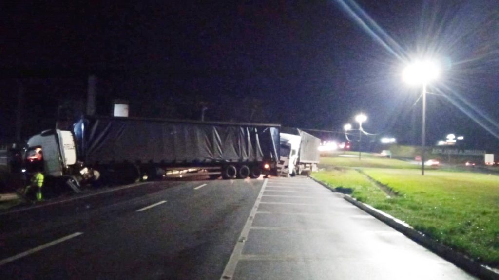 Acidente não teve vítimas, mas causou interdição da rodovia para que fosse realizado o transbordo da carga de um dos caminhões