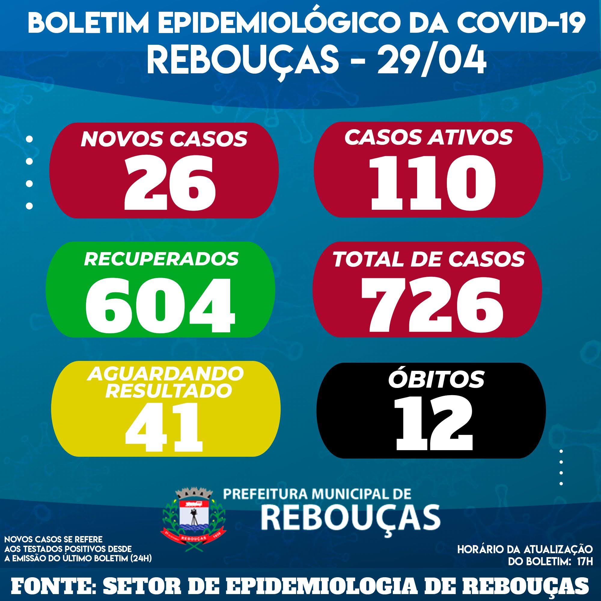 Com as duas mortes registradas hoje, Rebouças acumula 12 óbitos em virtude da Covid-19 desde o início da pandemia. Nesta quinta-feira, 26 novos casos de coronavírus foram confirmados no município. O total de casos ativos na cidade é de 110. Já o de pessoas diagnosticadas com a doença desde março de 2020 chegou a 726. 604 moradores já se recuperaram da infecção. Mais 41 pessoas aguardam resultado dos exames.