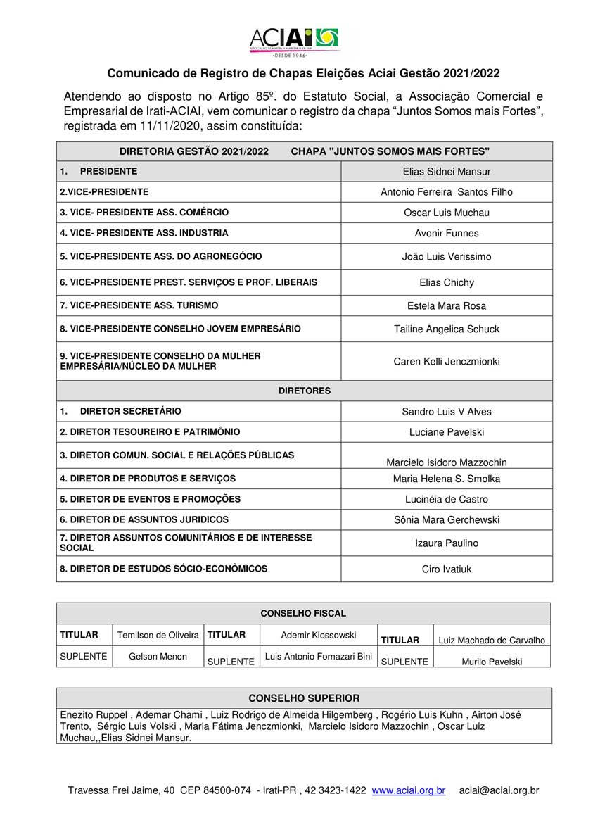Uma chapa única foi registrada para comandar a Associação Comercial e Empresarial de Irati (ACIAI) até o fim de 2021. A eleição dos conselhos de Administração, Superior e Fiscal da entidade acontece no dia 26 de novembro, quinta-feira, durante Assembleia que acontecerá das 9 às 12 h e das 13 e 18 h.