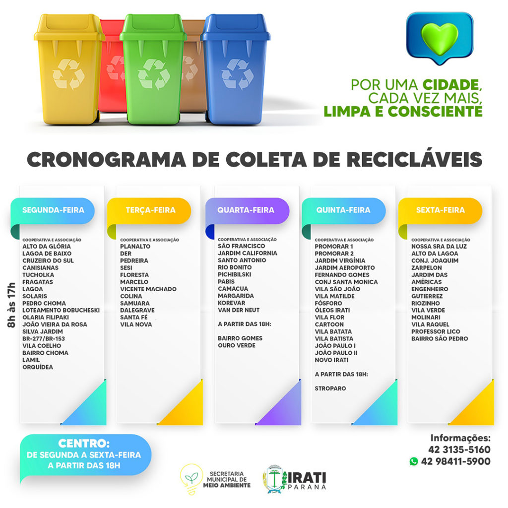 A empresa Ecovale, responsável pela coleta de lixo reciclável em Irati, alterou o cronograma de recolhimento na Vila Nova e na Vila São Pedro. Esses dois locais passaram a ser atendidos nas terças e sextas-feiras. O objetivo, conforme a administração municipal, é melhorar o sistema e reduzir o tempo de coleta.