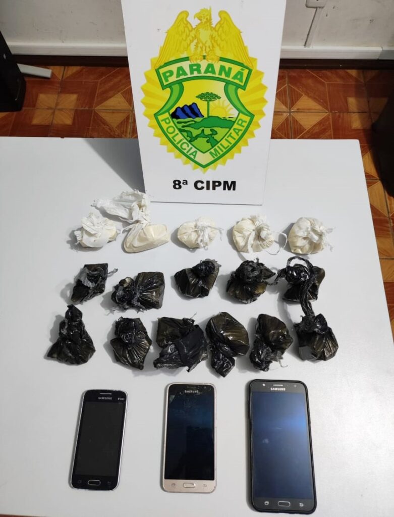 Apreensão de drogas: Em Irati, um homem foi preso após ser flagrado com drogas durante abordagem na rua Afrânio Mayer de Souza, no bairro Alto da Lagoa, na noite de sexta-feira. A equipe da Rotam abordou um jovem, de 22 anos, que estava com uma bucha de crack em seu bolso. Os policiais também encontraram uma bolsa contendo 854 gramas de crack. Além disso, foram apreendidos três celulares. A PM prendeu o homem e o conduziu para a Delegacia.