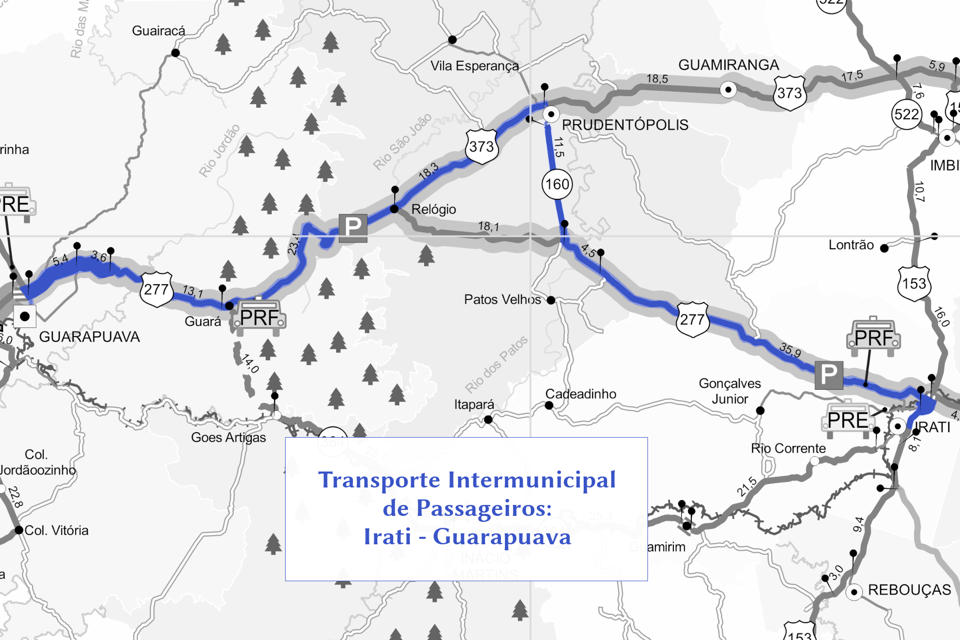 O Departamento de Estradas de Rodagem do Paraná (DER/PR) está convocando empresas do setor de transporte intermunicipal comercial de passageiros para executar em caráter provisório a linha Irati – Guarapuava, via Inácio Martins, com extensão de 115 km, e a linha Irati – Guarapuava, via Prudentópolis, com extensão de 119 km, utilizando veículos tipo ônibus ou micro-ônibus padrão rodoviário.