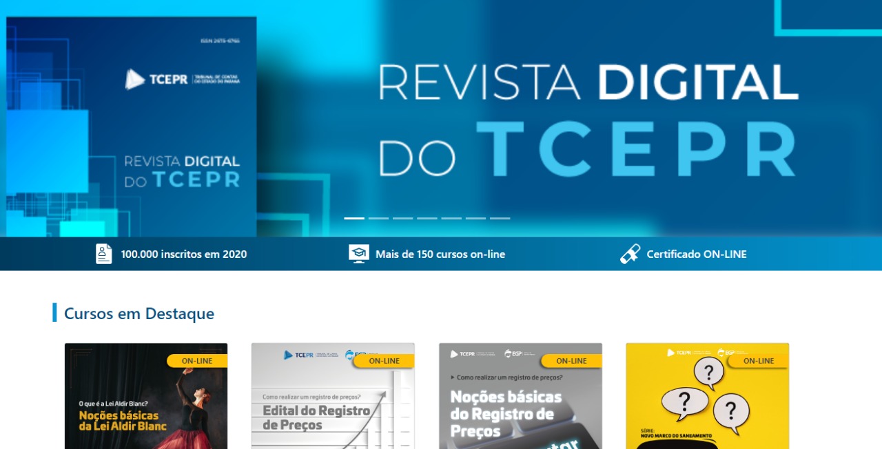 Acervo: Nos últimos anos, a EGP do TCE-PR consolidou sua plataforma de ensino a distância e se tornou referência nacional. Atualmente, o portal da Escola na internet oferece um acervo de mais de 150 cursos e palestras online, continuamente renovados ou revisados, que estão permanentemente à disposição dos interessados, de forma gratuita.