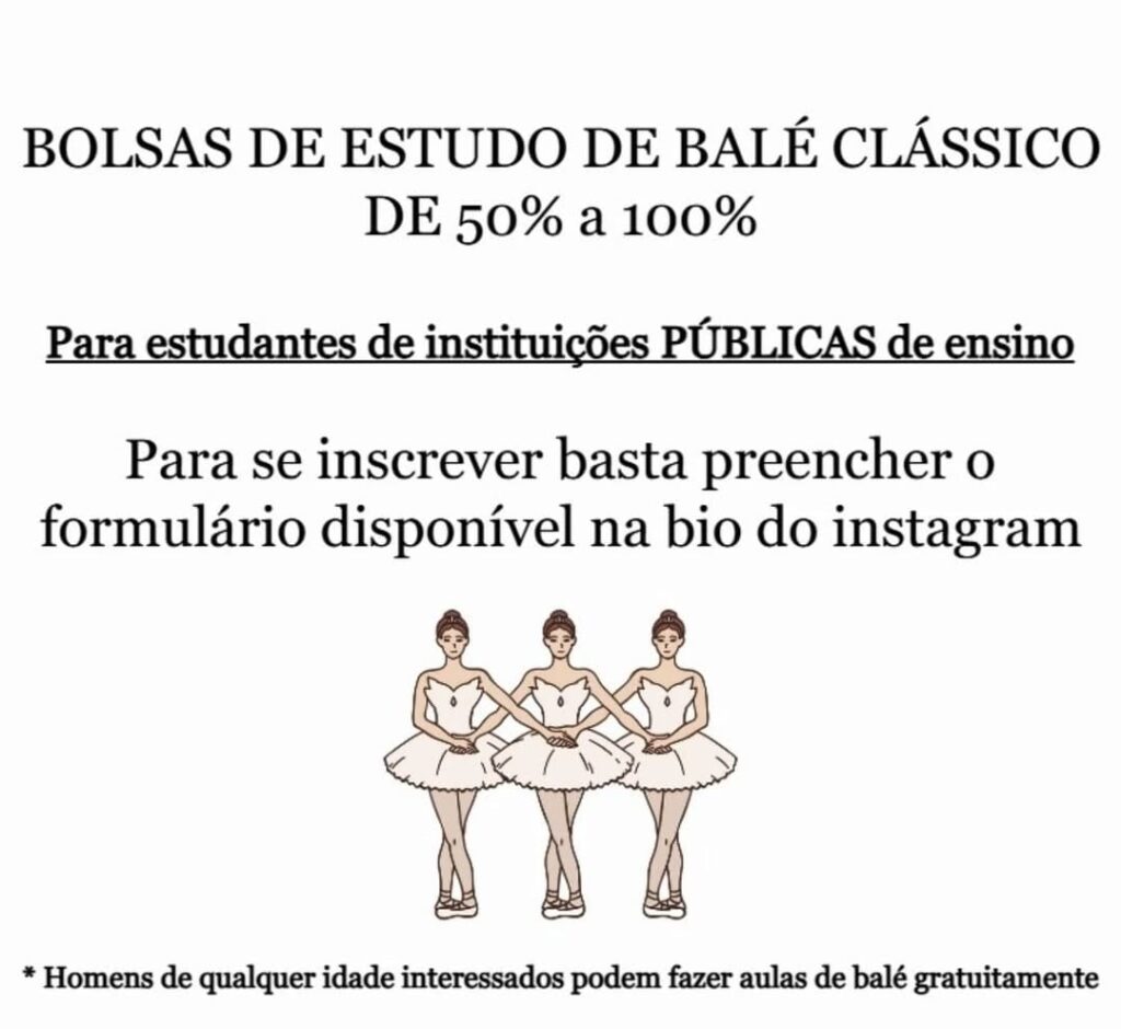 O Ballet Clube do Comércio, projeto desenvolvido pela professora Ana Flávia Martins, está com inscrições abertas para as turmas de 2025. Estão sendo oferecidas três bolsas de estudo de 100% e três de 50% para os alunos que sempre estudaram em escolas públicas.