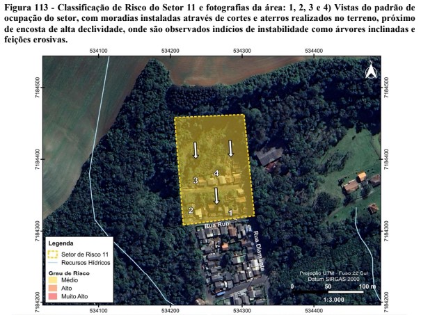 O estudo classifica as áreas em setores e o nível de risco em cada área. Foram identificados 13 setores de risco, sendo cinco regiões com médio risco de possibilidades de deslizamento. Áreas dos bairros Canisianas e Vila Nova, além de partes do bairro Riozinho, próximo à BR-153, estão na lista.