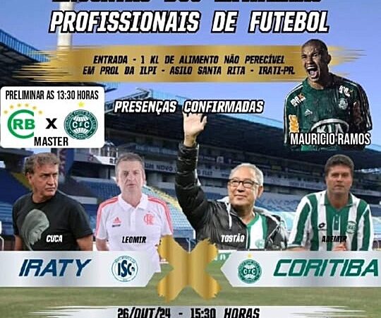 Ex-jogadores do Iraty Sport Club e do Coritiba farão um jogo amistoso neste sábado, 26, a partir das 15h30min, no Estádio Coronel Emílio Gomes. Torcedores poderão levar 1 kg de alimento não perecível. As doações serão revertidas para a Instituição de Longa Permanência de Idosos (ILPI) Santa Rita (Asilo Santa Rita), localizada no bairro Lagoa.