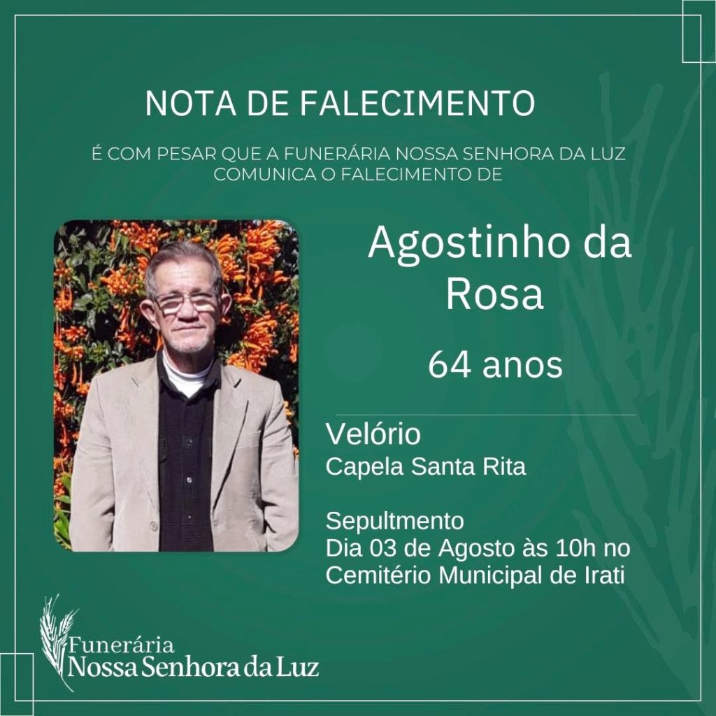O velório de Agostinho está acontecendo na Capela Mortuária Santa Rita, em Irati. Já o sepultamento ocorrerá nesta quinta-feira, às 10 h, no Cemitério Municipal de Irati.