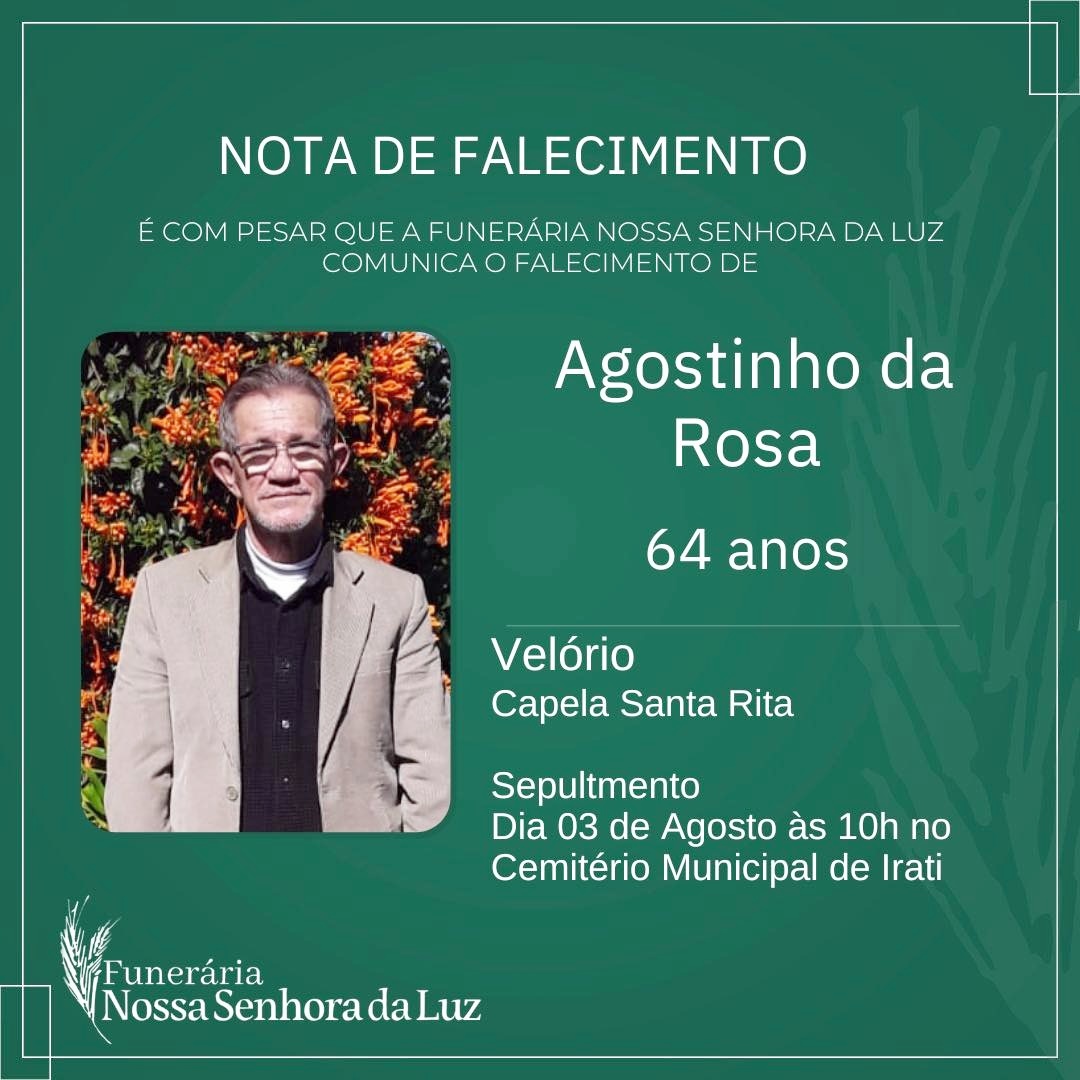 O técnico em contabilidade e narrador esportivo, Agostinho da Rosa, faleceu nesta quarta-feira em sua casa em Irati. Ele tinha 64 anos e morava no bairro Floresta. A causa da morte foi um câncer (melanoma) na coluna e no cérebro, que havia sido diagnosticado recentemente.