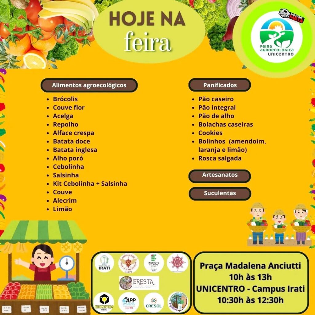 A Feira Agroecológica do Campus Irati da Universidade Estadual do Centro-Oeste (Unicentro) acontece toda quinta-feira, de forma simultânea em dois locais. Um deles é a praça Magdalena Anciutti, conhecida como “Praça da Bíblia”, em frente à Paróquia São Miguel, das 10 às 13h. Já das 10h30 às 12h30, os produtos também são comercializados no prédio da Unicentro.