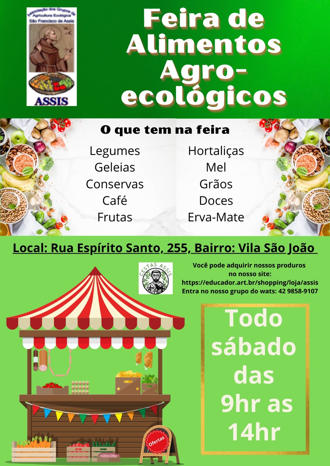 A feira agroecológica da Associação Assis foi retomada no sábado (14) em Irati. Os produtos orgânicos serão comercializados todos os sábados, das 9 às 14 h na rua Espírito Santo, na Vila São João, próximo ao posto de saúde. Entre os diversos produtos vendidos estão legumes, geleias, hortaliças, mel, conservas, café, frutas e erva-mate.