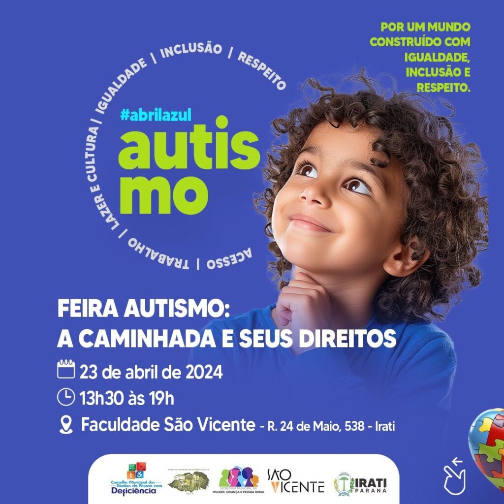 A Feira “Autismo: a caminhada e seus direitos” será realizada nesta terça-feira em Irati. O encontro será promovido pela prefeitura de Irati em parceria com a Faculdade São Vicente. Ele é voltado para pessoas autistas e suas famílias. A feira terá início às 13h30 e será finalizada às 19h na Faculdade São Vicente, na rua 24 de Maio, número 538.