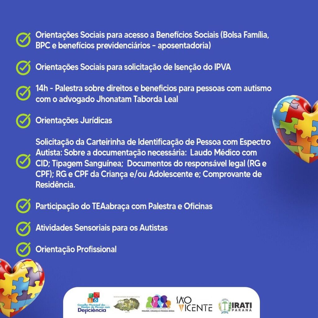 As pessoas presentes também poderão solicitar a carteirinha de identificação da pessoa com Espectro Autista. Entre os documentos que devem ser apresentados para emissão da carteirinha estão laudo médico com a Classificação Internacional de Doenças (CID), tipagem sanguínea, documentação do responsável legal (RG e CPF), RG e CPF da criança ou do adolescente e comprovante de residência. A programação do evento ainda prevê a participação da associação Irati TEAbraça com palestras e oficinas, além da realização de atividades sensoriais para os autistas e orientação profissional.