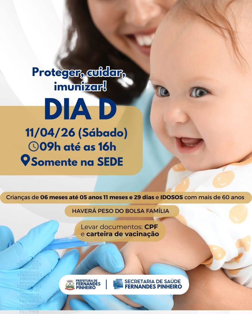 A Prefeitura de Fernandes Pinheiro realiza no próximo sábado, dia 11 de abril, o Dia D de vacinação, com atendimento voltado principalmente para crianças e idosos do município.