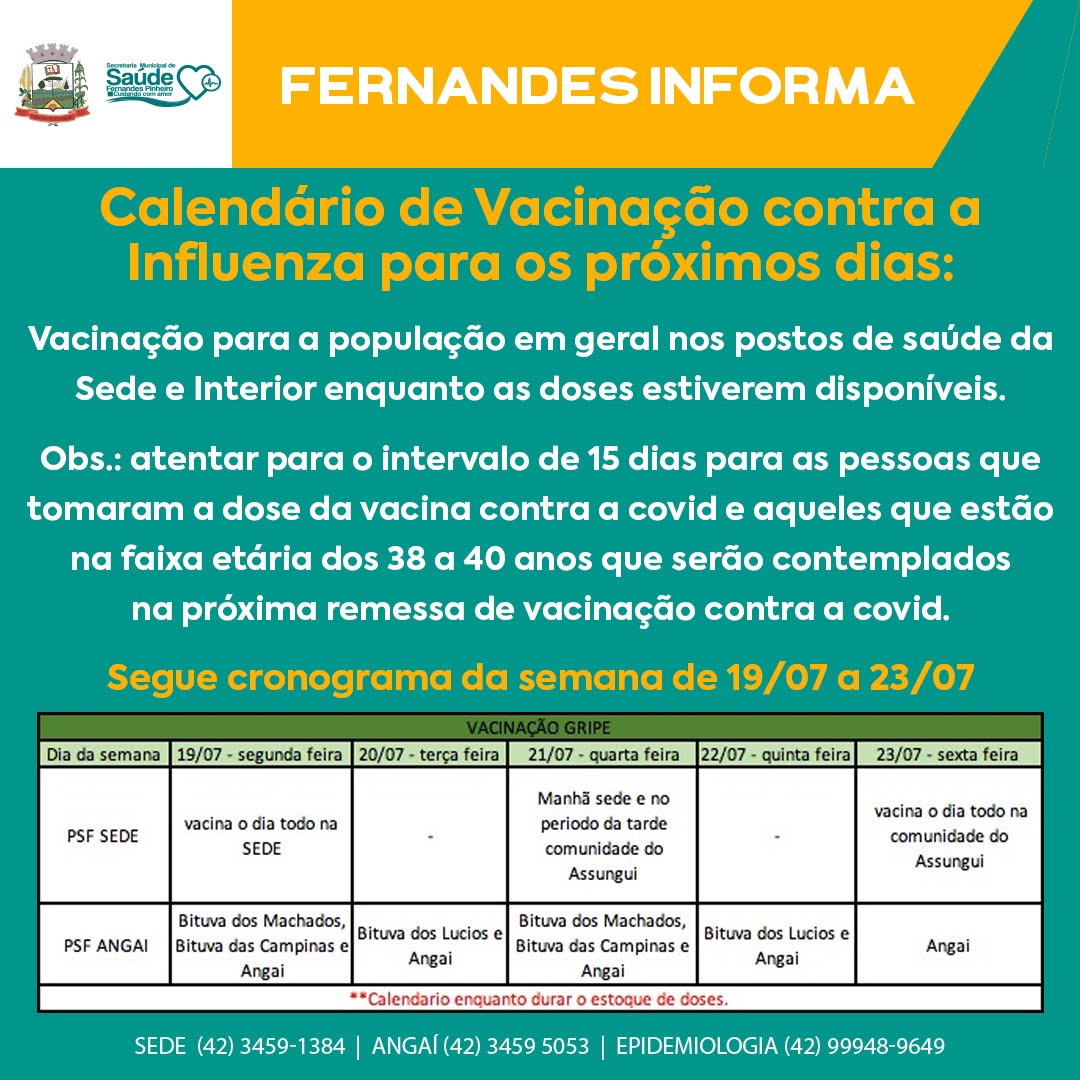 A secretaria de Saúde de Fernandes Pinheiro também divulgou o calendário de vacinação contra a gripe válido até sexta-feira, 23. O cronograma é válido enquanto as doses estiverem disponíveis.