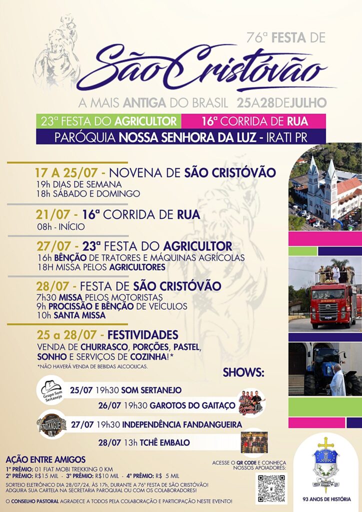 Será realizada no próximo fim de semana, entre os dias 25 e 28 de julho, a 76ª Festa de São Cristóvão, na Paróquia Nossa Senhora da Luz, em Irati. A programação inclui a 16ª Corrida de São Cristóvão, realizada no último domingo, 21, e a 23ª Festa do Agricultor, que será no próximo sábado, dia 27.