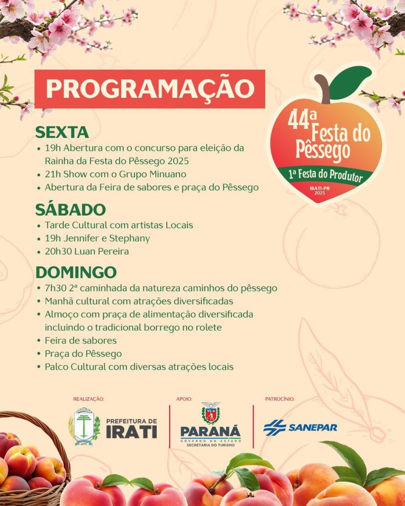 A 44ª Festa do Pêssego e a 1ª Festa do Produtor de Irati começam nesta sexta-feira (5) e seguem até o domingo (7), no Parque Aquático, com entrada gratuita. A programação reúne shows, feira de sabores, atrações culturais e atividades voltadas à valorização dos produtores rurais do município.