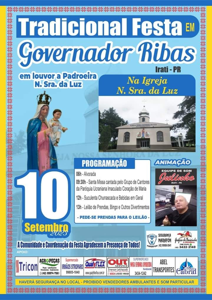 Tradicional festa em Governador Ribas na Igreja Nossa Senhora da Luz, dia 10 de setembro, em louvor a Padroeira Nossa Senhora da Luz