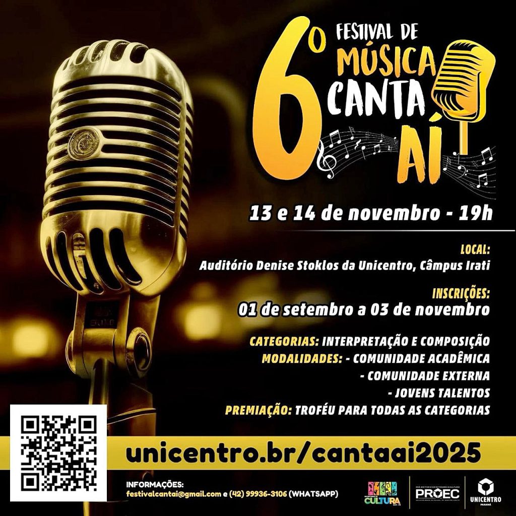 O evento será realizado nos dias 13 e 14 de novembro no Auditório Denise Stoklos do campus Irati da instituição. As inscrições estão abertas até o dia 03 e podem ser feitas pelo site unicentro.br/cantaai2025. Mais informações podem ser obtidas pelo WhatsApp (42) 99936-3106 ou pelo e-mail festivalcantai@gmail.com.